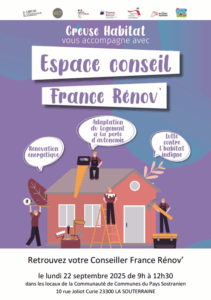 La prochaine permanence habitat, qui est liée à la thématique de la rénovation des logements, aura lieu le Lundi 22 Septembre 2025 de 9h00 à 12h30 dans les locaux de la Communauté de Communes du Pays Sostranien (10 rue Joliot Curie à La Souterraine).